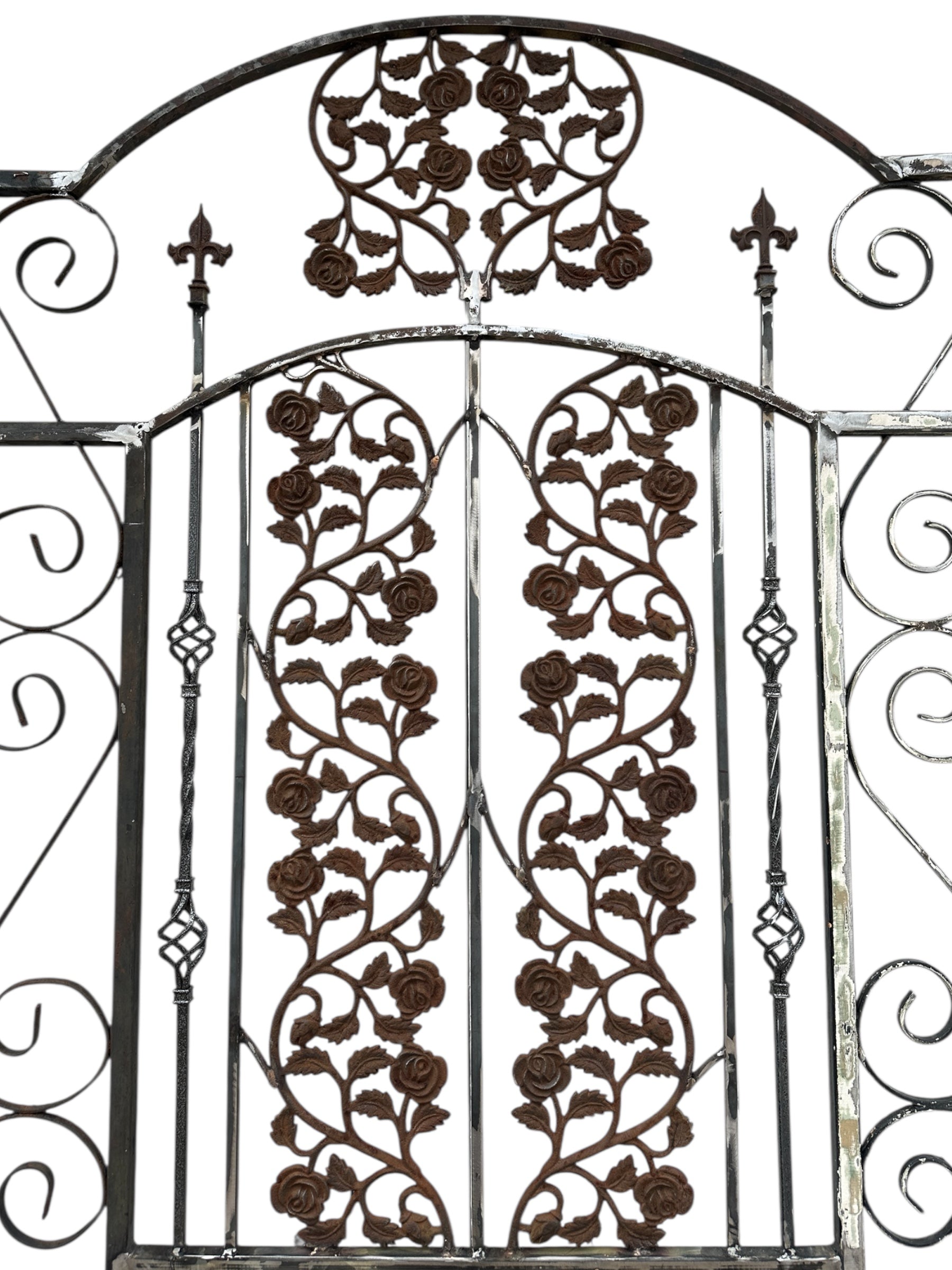This is a custom-built arched top steel gate with antique salvaged cast iron elements and curved steel pieces, designed to enhance the aesthetic appeal of any garden or outdoor space.