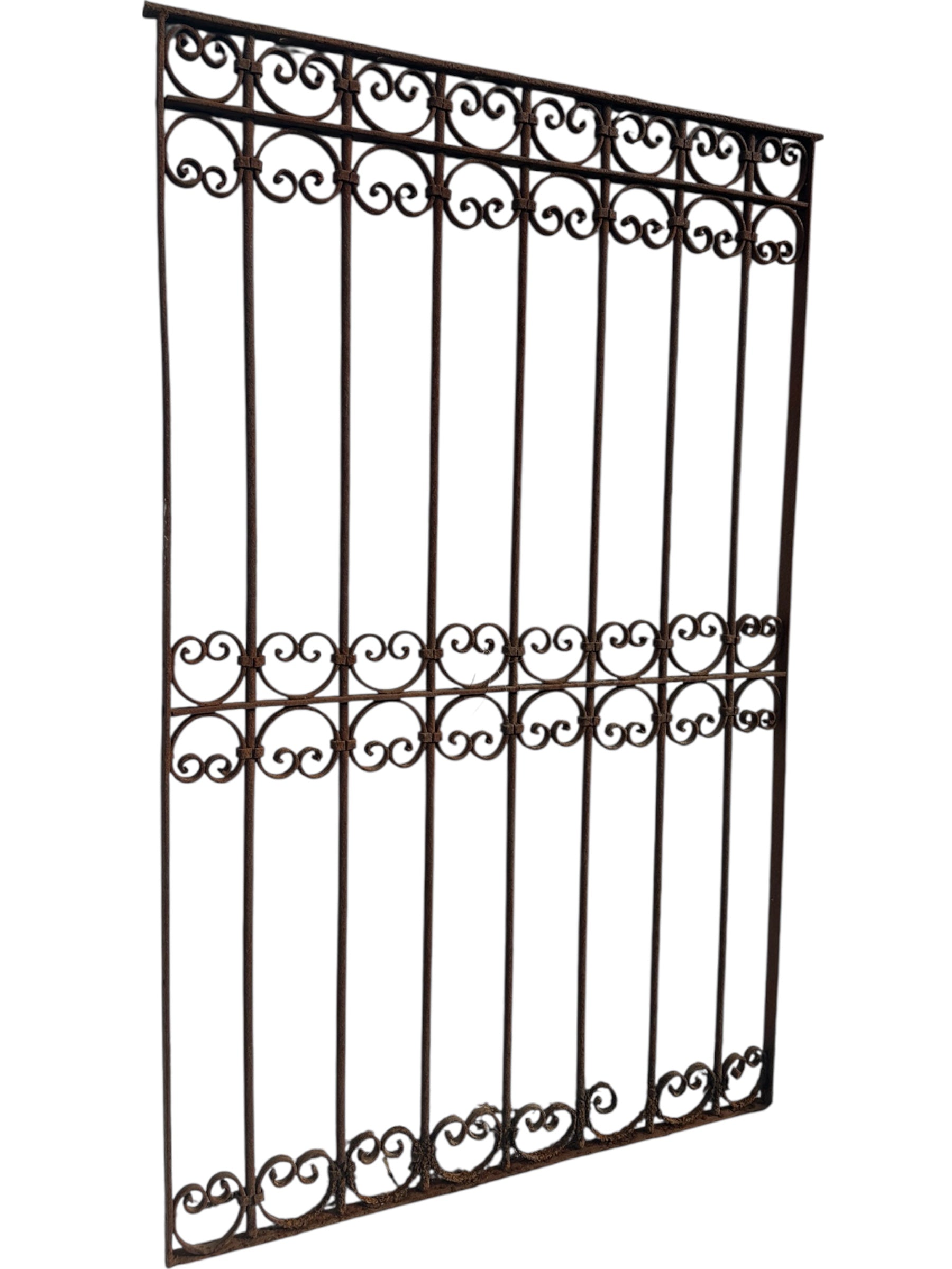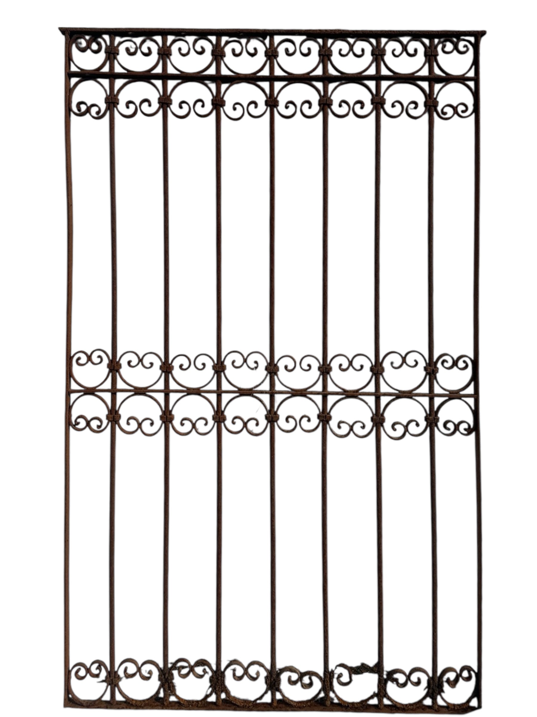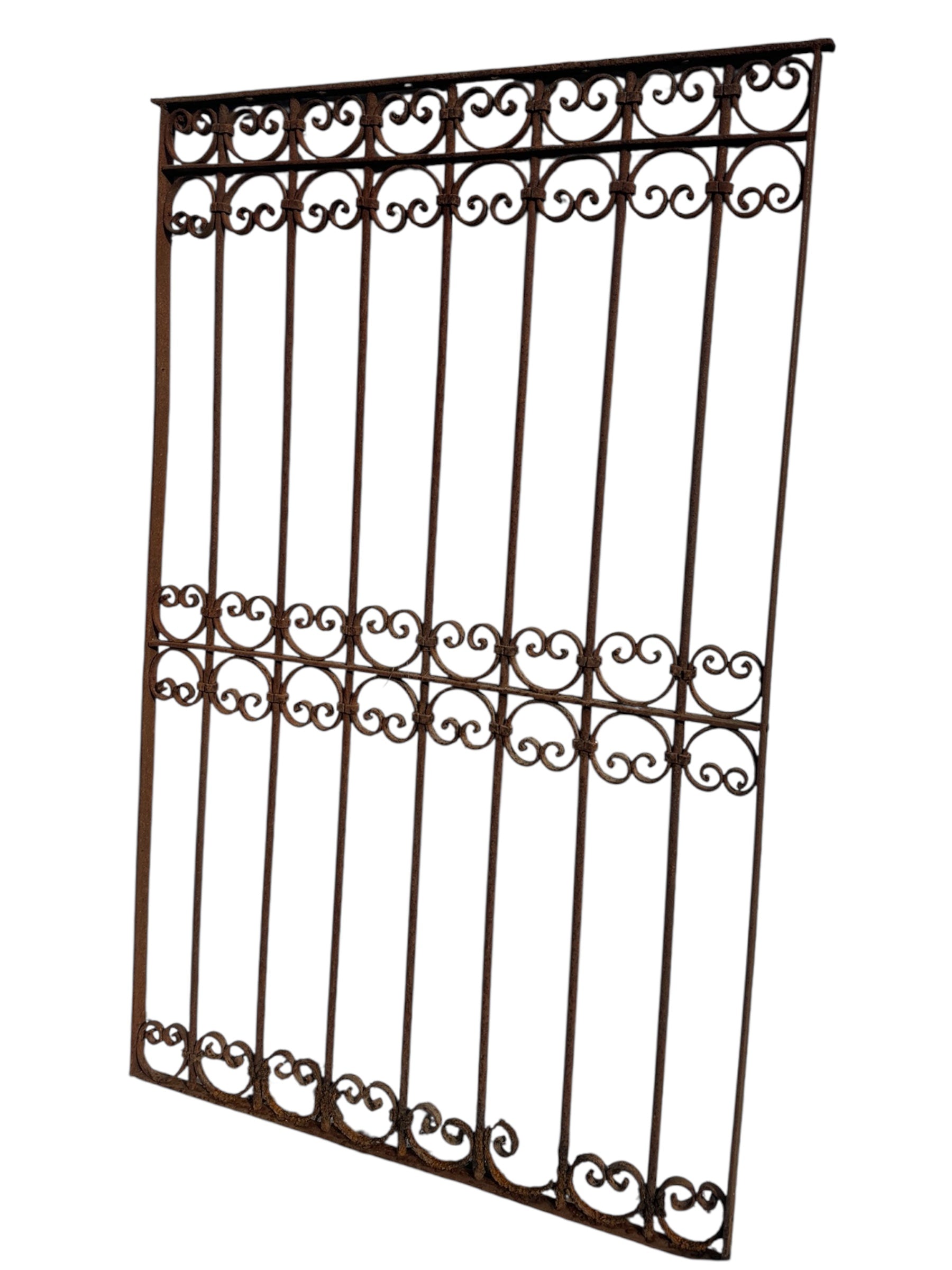 This Antique Wrought Iron Gate is a striking piece of architectural and garden décor. Crafted from durable wrought iron, this gate stands at 60 inches tall, adding a touch of history and elegance to any space.