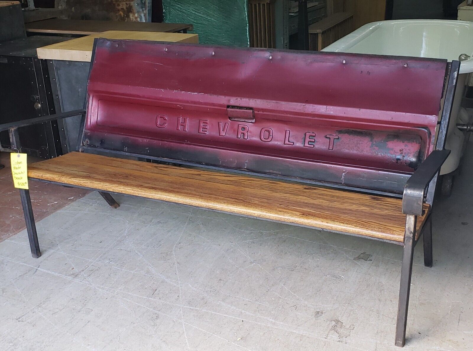 This is a custom made Chevrolet Tail Gate Bench. The frame is made from steel and iron.