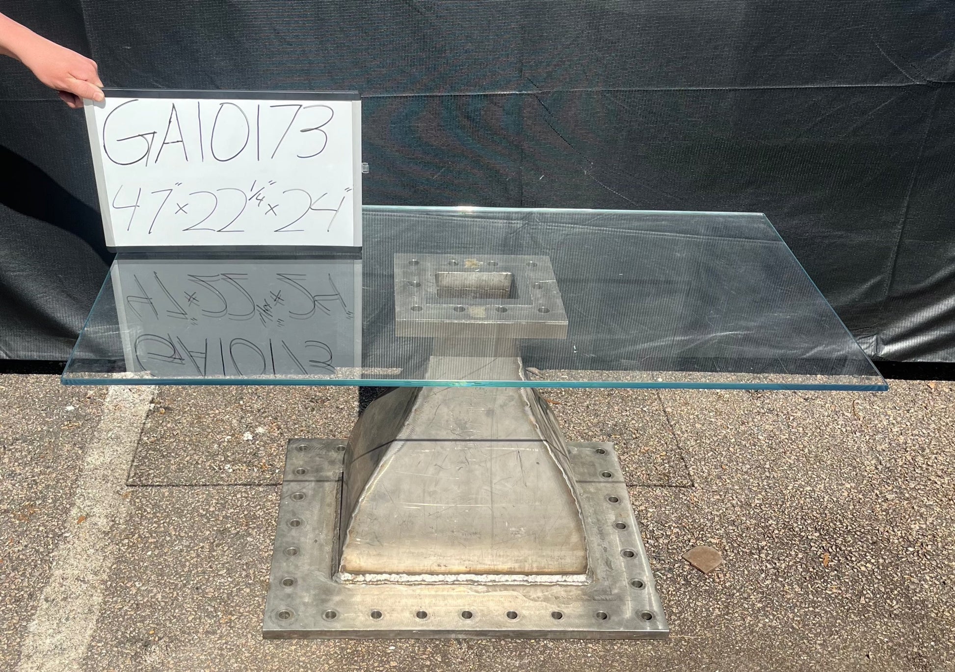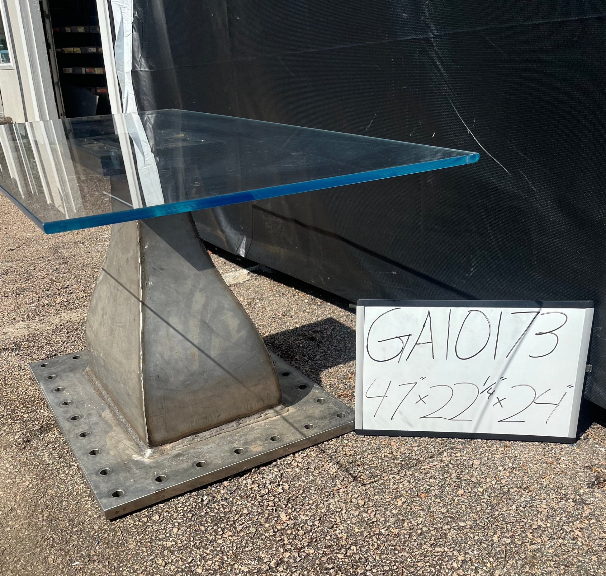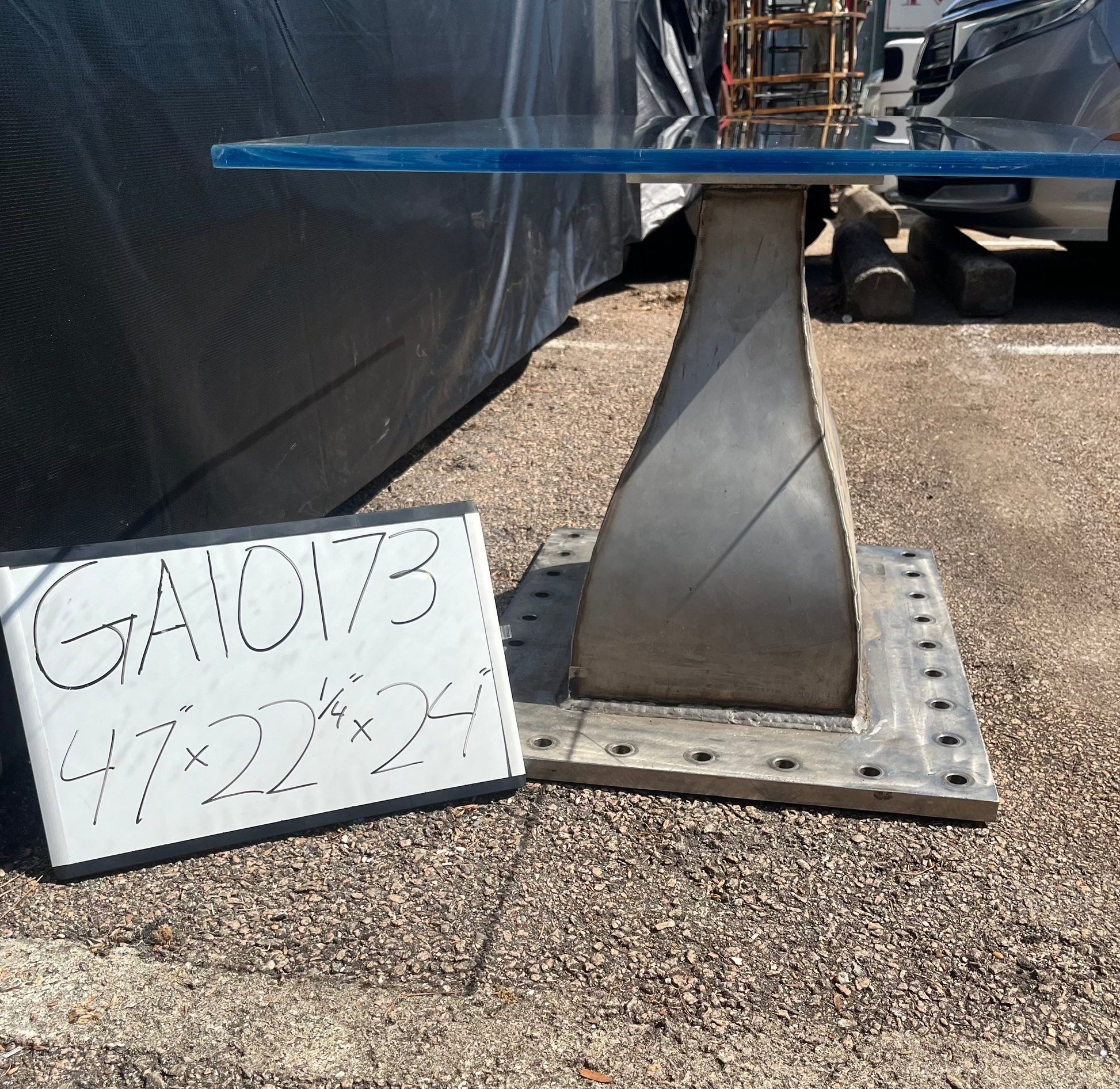 Glass top reclaimed aerospace parts table. Unique piece!
