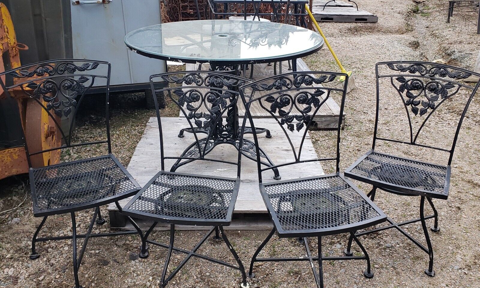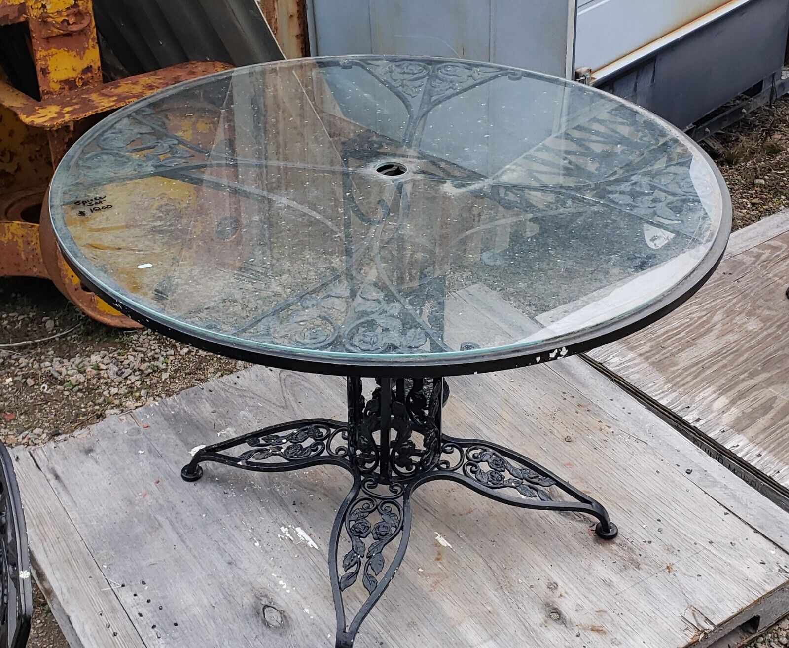 This five (5) piece table and chair set is in excellent condition and was very well made. The 42" round wrought iron table has a thick round glass top (no cracks or chips) with umbrella hole at the center. The unique center base and 4 legs have an Art Nouveau filigree style.