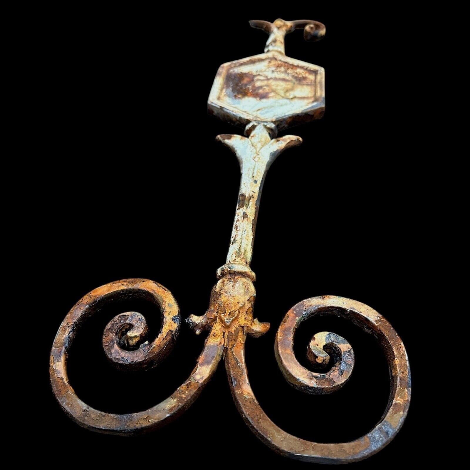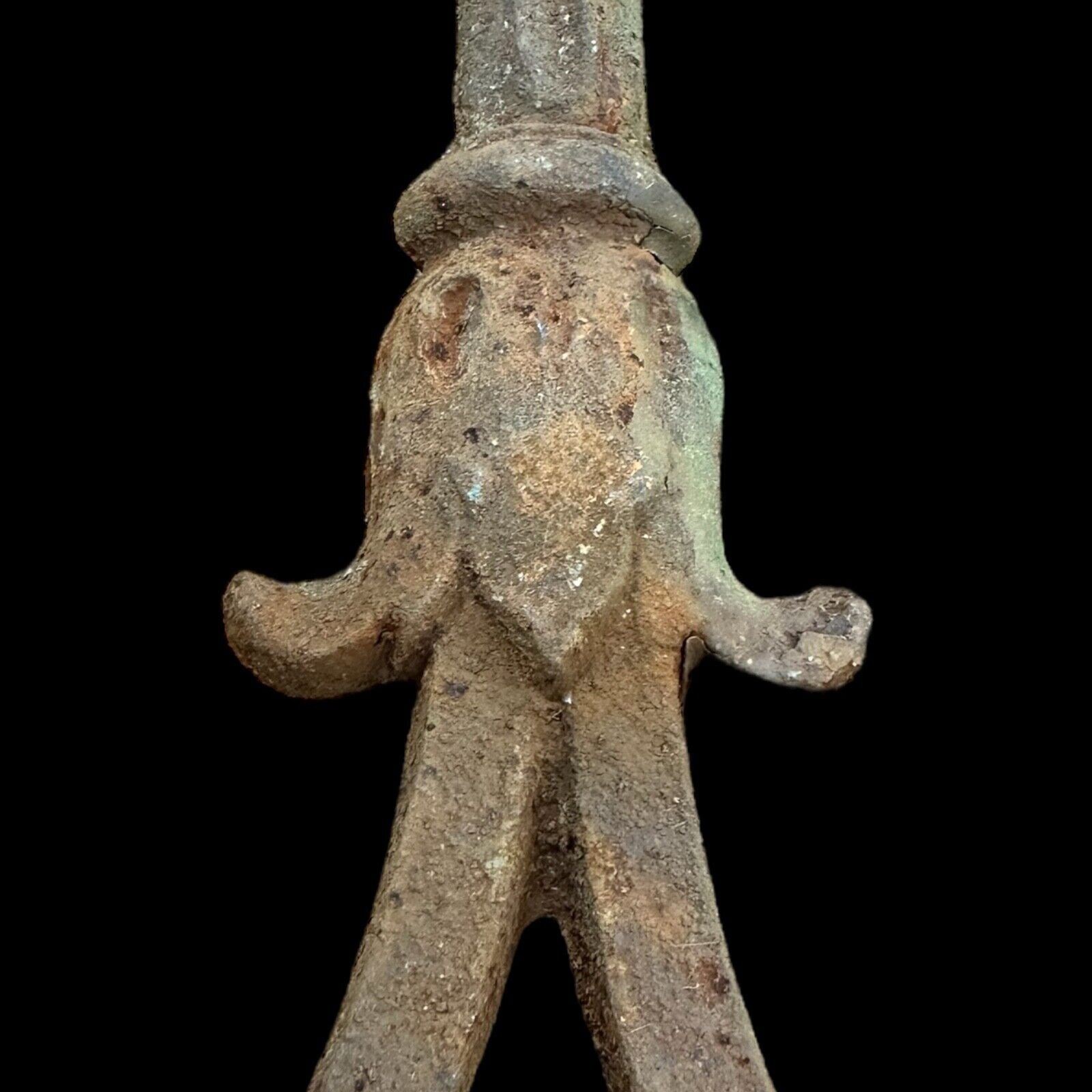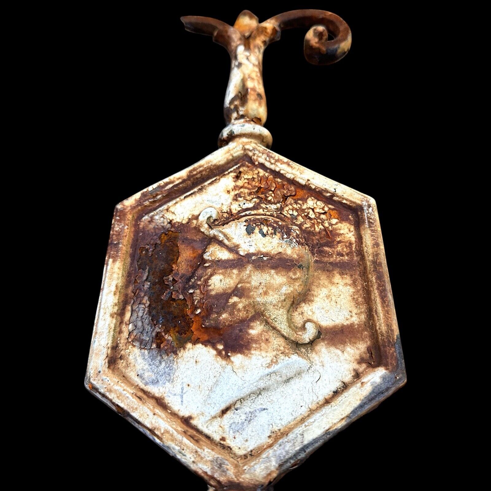 This is a Pair Cast Iron double sided Spindles feature the faces of roman soldiers. These are reclaimed architectural pieces that are designed with intricate details, adding a unique touch to any space.