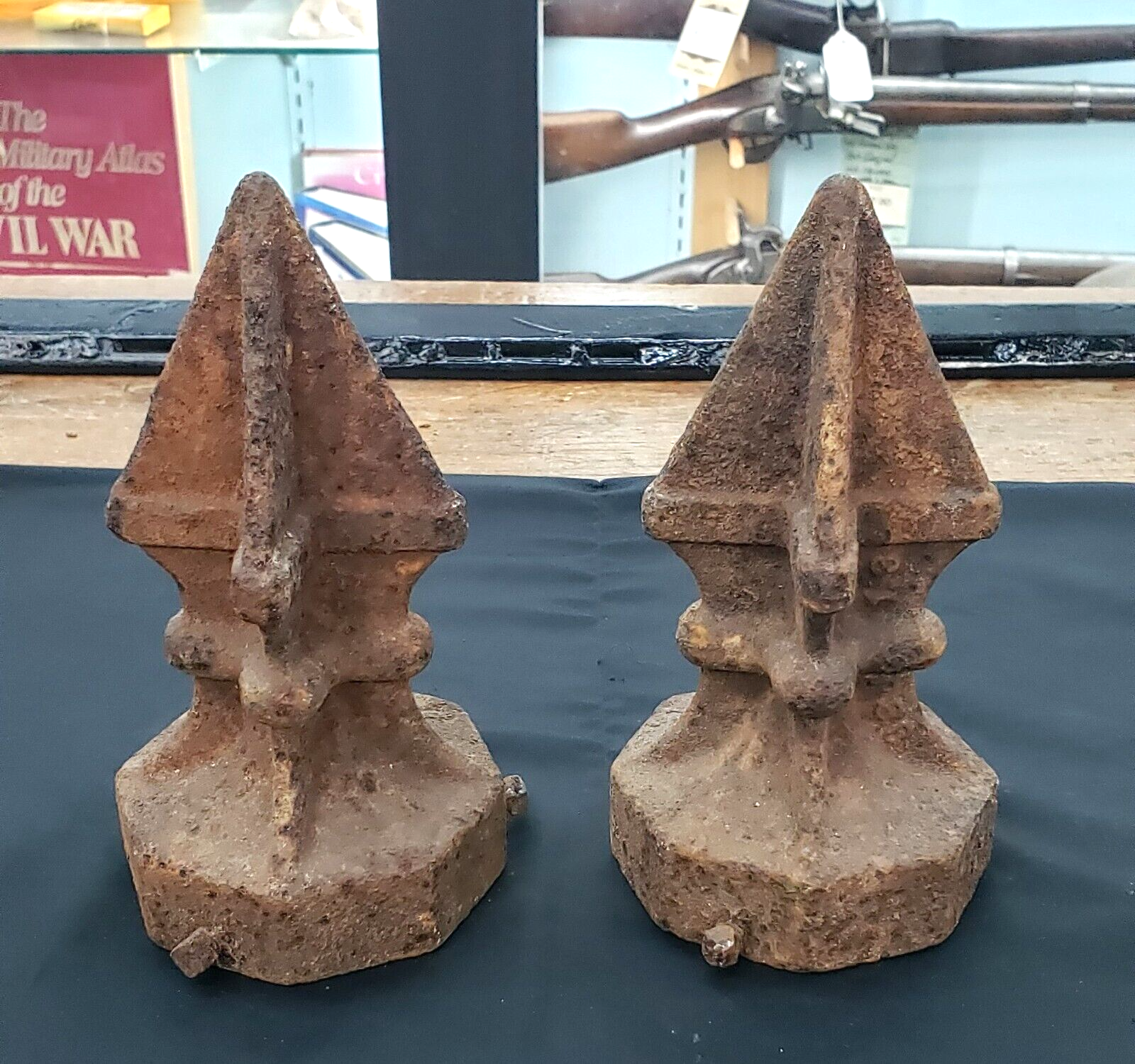 These cast iron finials were placed on top of an old gas station sign pole top. Each one is free from cracks and measure 7 1/2" tall by 4" in diameter. The bottom fitter is octagon shaped and 4" in diameter. Original set screws remain at the bottom as well.