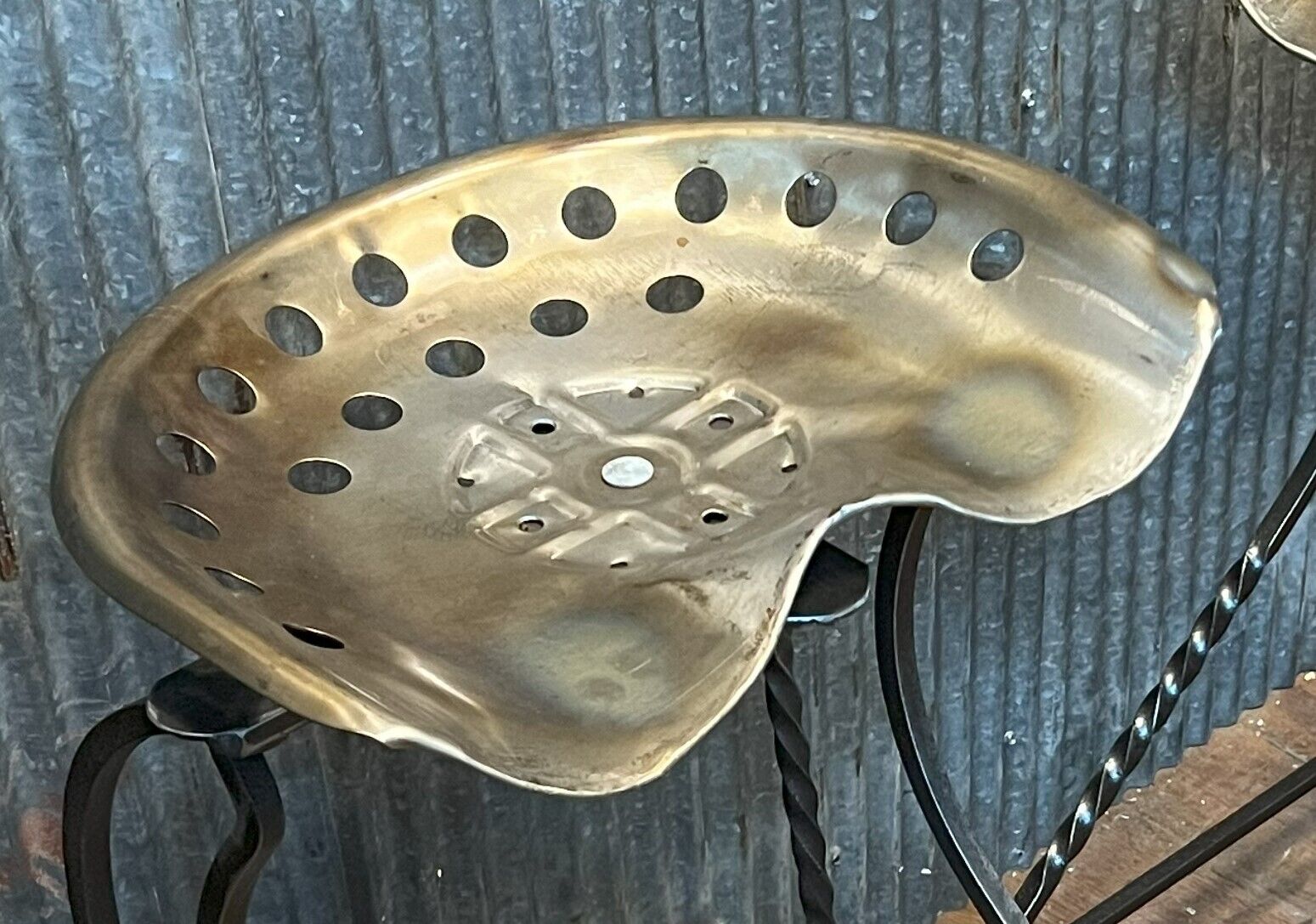 A Governor's original and fabricated here in our welding shop! We upcycled steel tractor seats and wrought iron fencing to create some fantastic one of a kind bar stools. The tractor seats were wire wheeled down to the bare metal, then we applied a clear coat finish. The frame and legs were gathered from iron gates and fencing we have on site. 15 are available should you need more than one. Price is for one (1) stool.