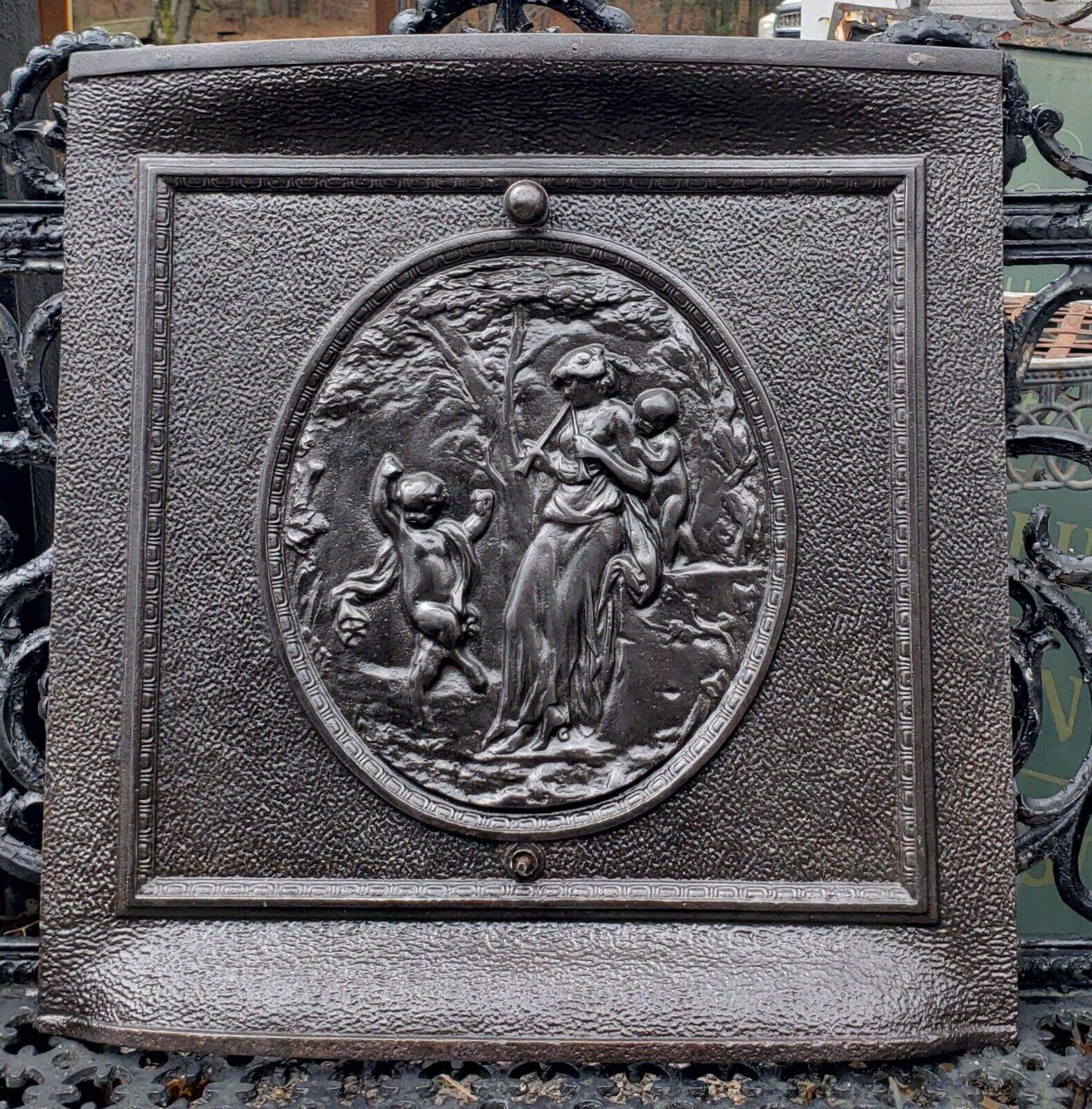 The cover has a hammered design outside of the center piece with a square egg & dart outer trim. The center design is of a woman playing an instrument with two young cherub like children.