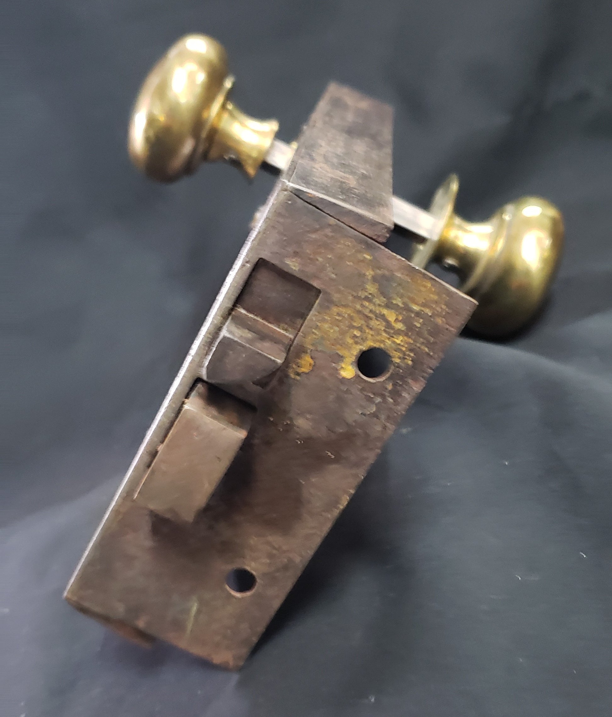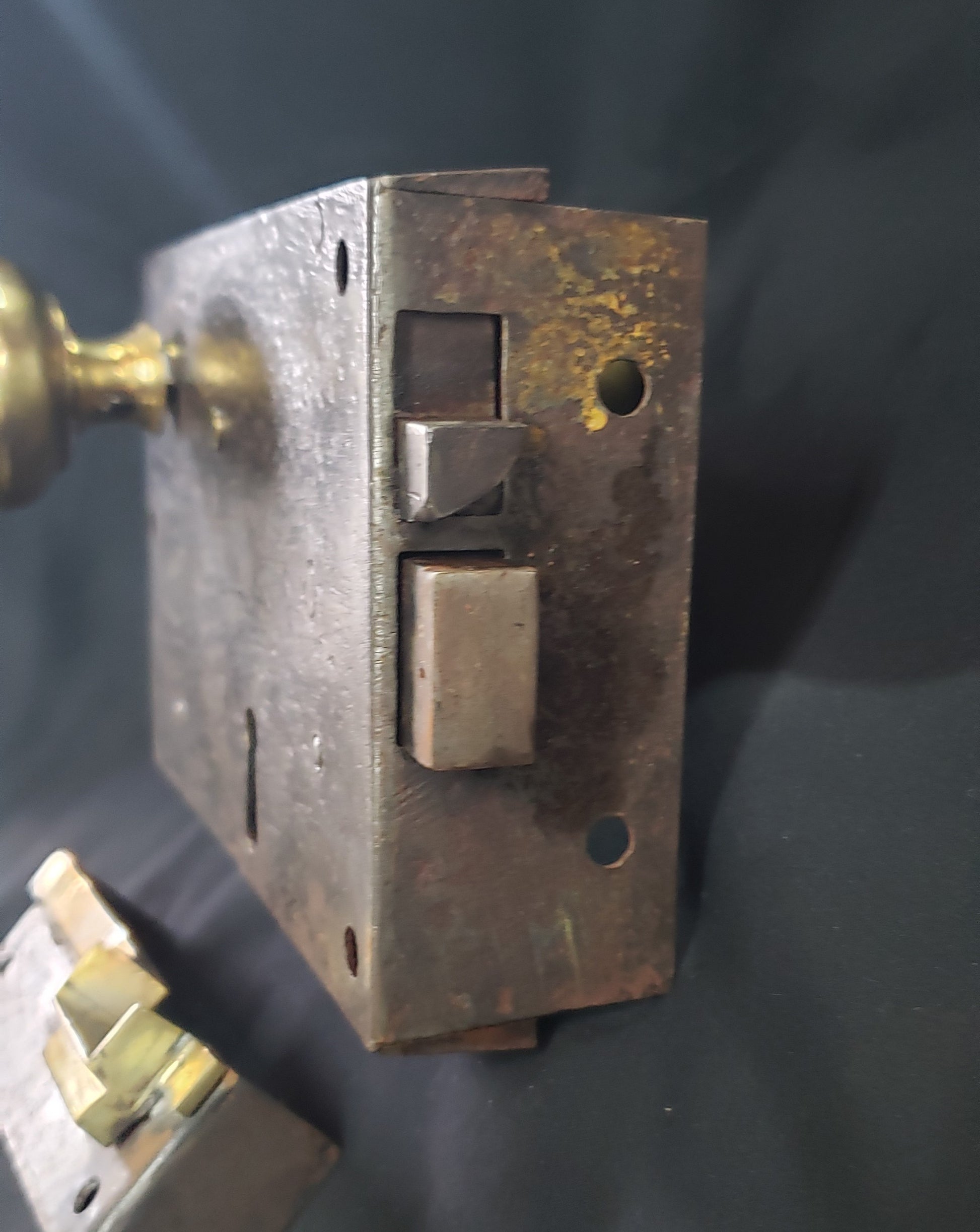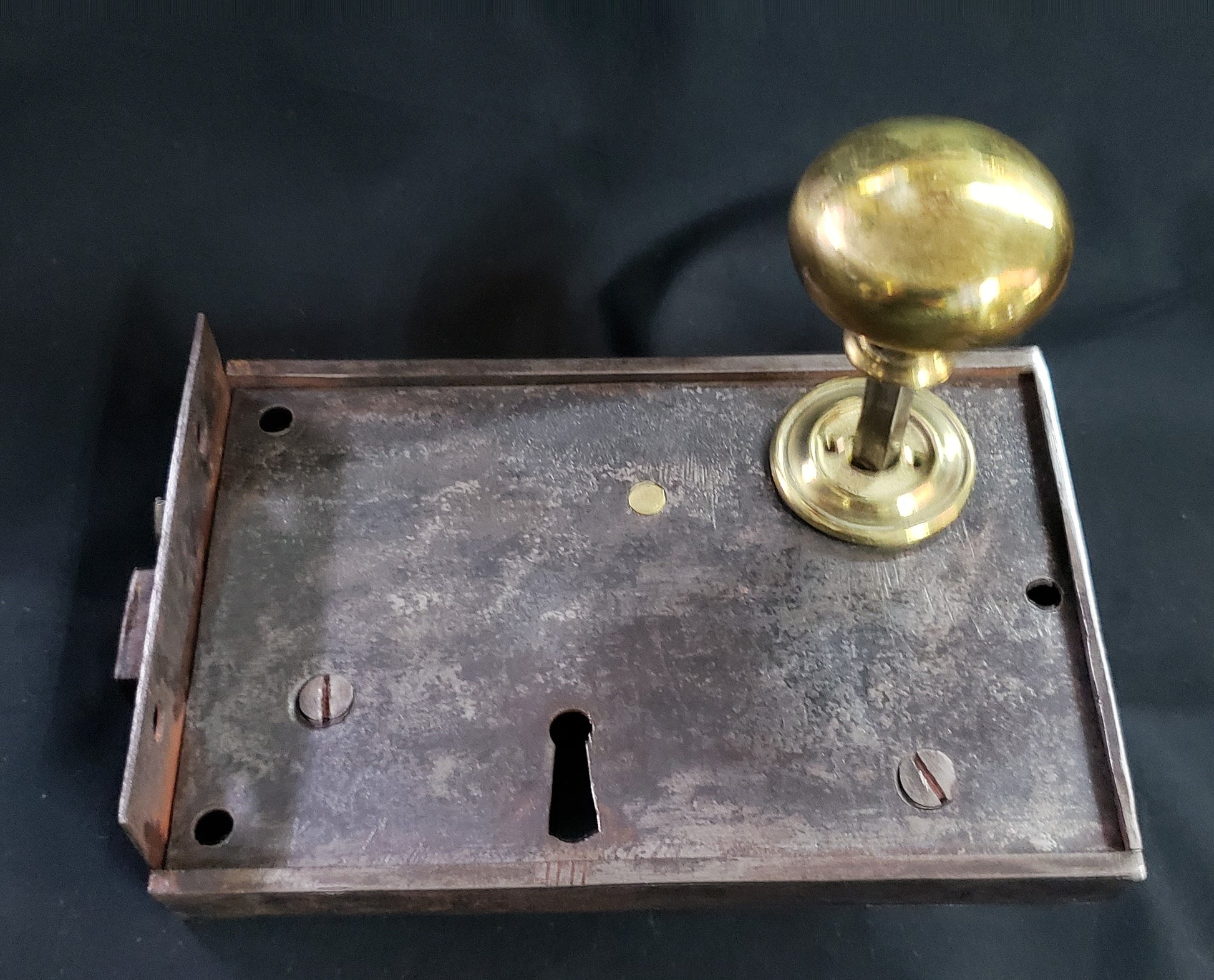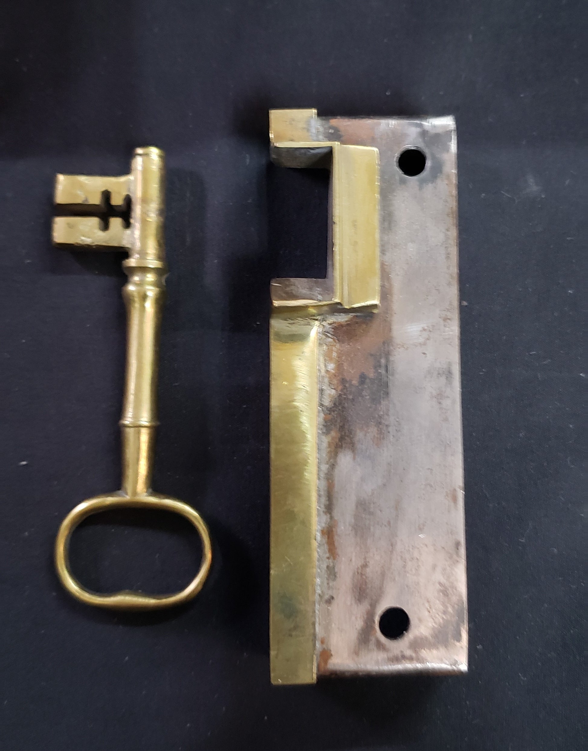 We restored this lock set within our Brass Foundry by adjusting the lock mechanism, creating a working brass key along with iron and brass keeper.
