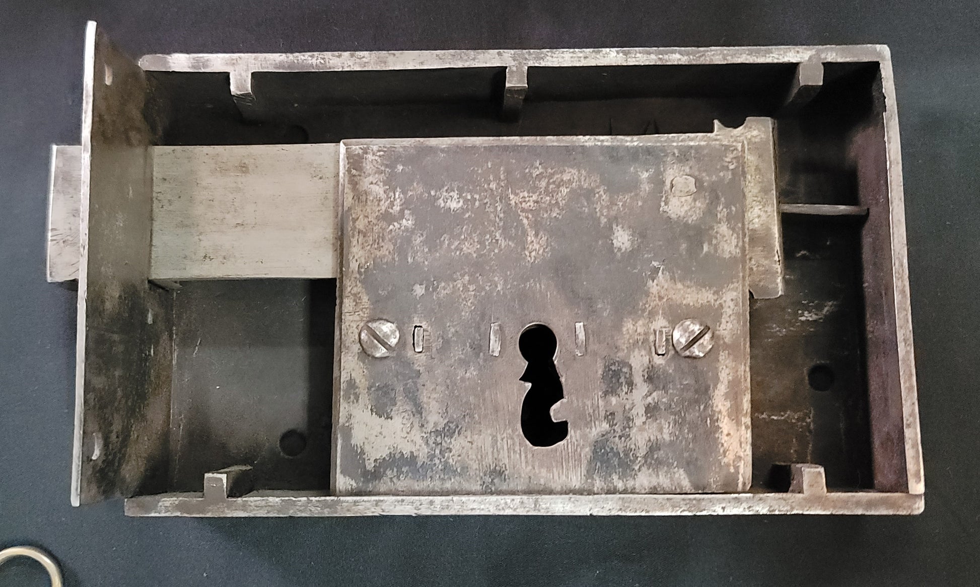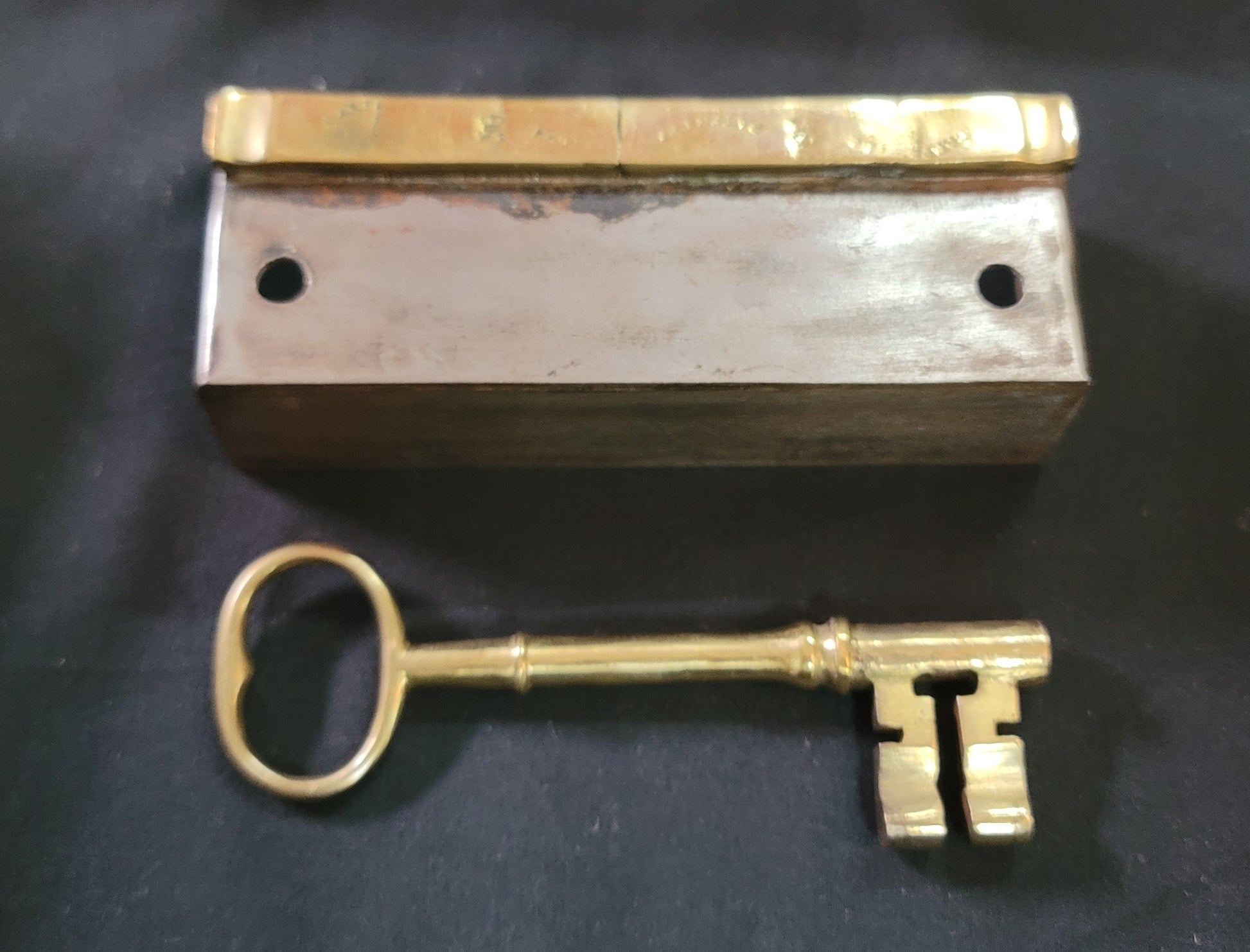 We restored this lock set within our Brass Foundry by adjusting the lock mechanism, creating a working brass key along with iron and brass keeper.