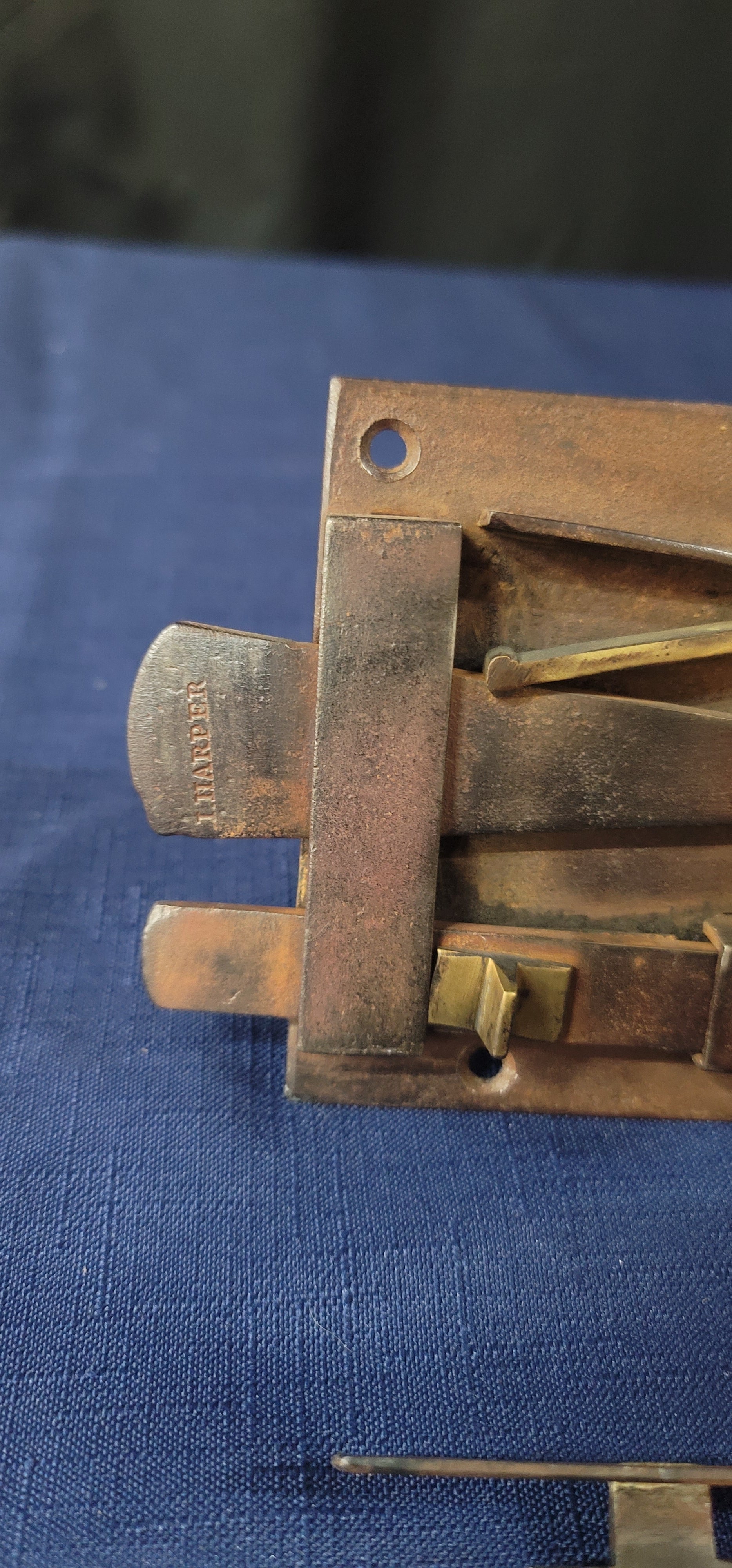 Vintage Harper Iron & Brass Lever Rim Lock & Knobs 4" x 3 3/4" GS00743